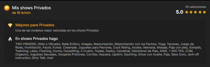 Fenekelés, Szopás, Masszás, Lábmunka, Sztriptíz, Twerk, Latex, Villantás, Zuhany, Arcra ülés, Kutyapóz, Félmeztelen, Ujjazás, Tevepata, Lábfétis, TWO FINGERS, Dildó vagy vibrátor, Erotikus tánc, Ahegao, Maszturbálás, Cici baszós, Jóga, Magassarkú, Szerepjáték, Megalázás, Arc, Cigizős, Ondós punci, Mellbimbó izgatók, Farok értékelés, ANAL + 600 TKS, CUM, Orgazmus, Szexjátékok, Mély torok, Élvezés, Lovaglás, Felcsúszott szoknya, Spriccelés, Olajozás, Kézimunka, Hardcore, Kiverési utasítások, Mocskos beszéd, Anál